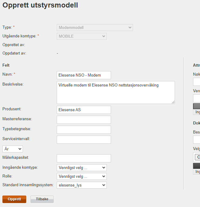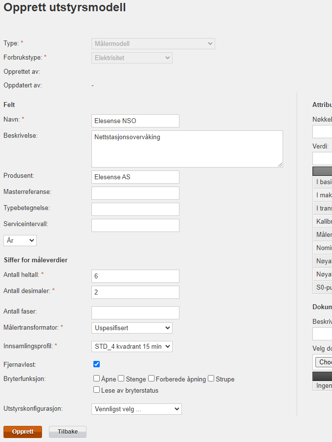 Fyll inn minimum namn, og trykk «Opprett». Ein treng ikkje fylle inn «Attributter» og «Dokumenter».