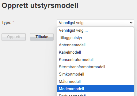 For å opprette modemmodell vel ein «Modemmodell» i nedtrekkslista.