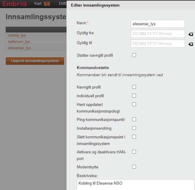 Ein legg inn eit beskrivande namn, i dette eksempelet elesense_lys der lys er dei tre første bokstavane til nettselskapet Lysna. Legg gjerne inn ein beskrivelse om innsamlingssystemet også.