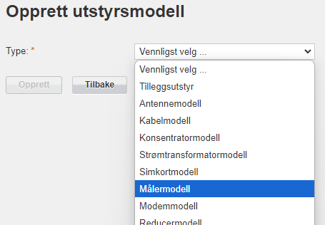 For å opprette målermodell vel ein «Målermodell» i nedtrekkslista.